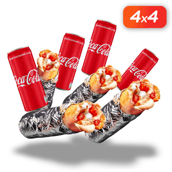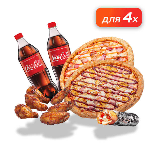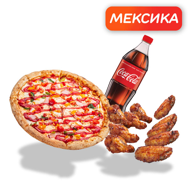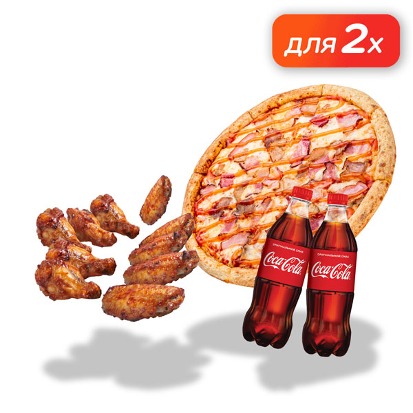 874,00 ₴Піца М’ясна, піца BBQ, курячі крильця негострі 280г ±30г, рол з курочкою, Coca-Cola 0,75 л. 2 шт.